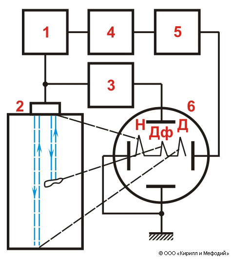Блок-схема ультразвукового эходефектоскопа: 1 — генератор электрических импульсов; 2 — пьезоэлектрический преобразователь (искательная головка); 3 — приемно-усилительный тракт; 4 — хронизатор; 5 — генератор развертки; 6 — электронно-лучевая трубка; Н — начальный сигнал; Д — донный эхосигнал; ДФ — эхосигнал от дефекта.