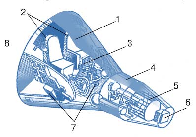 Схема спускаемого аппарата космического корабля «Джемини»: 1 – герметическая капсула; 2 – кресла астронавтов; 3 – приборная доска; 4 – отсек системы ориентации; 5 – контейнер с парашютом; 6 – радиолокатор для сближения на орбите; 7 – бортовая аппаратура; 8 – теплозащитный экран.