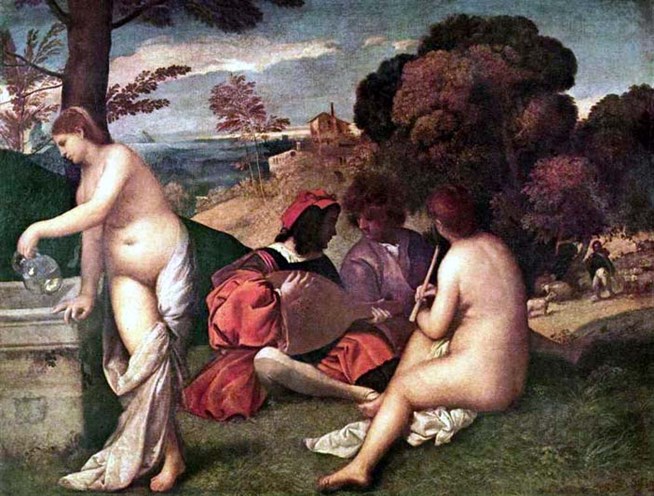 Джорджоне (совместно с Тицианом). Сельский концерт (концерт под открытым небом). 1508-1510 годы. Париж. Лувр.
