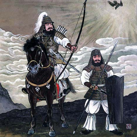 Легендарный основатель японского государства Дзимму-тэнно со своим воином. Средневековая миниатюра.