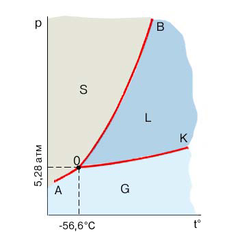 Диаграмма состояния диоксида углерода СО2. ОА (кривая возгонки) отвечает равновесию твердого и газообразного СО2; ОК (кривая испарения) – жидкого и газообразного СО2; ОВ (кривая плавления) – твердого и жидкого СО2. Точка О (тройная точка) отвечает равновесию всех трех фаз. Площадь диаграммы делится этими кривыми на области существования трех фаз: S – твердой, L – жидкой и G – газообразной.