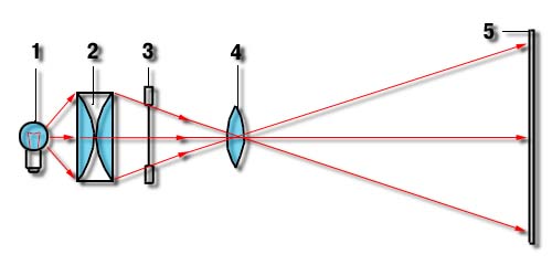 Диапроектор (оптическая схема): 1 — источник света (проекционная лампа); 2 — конденсор; 3 — диапозитив (слайд), диафильм; 4 — объектив; 5 — экран.