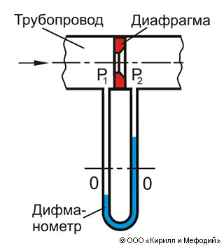 Схема установки диафрагмы в устройстве для измерения расхода жидкости. Принцип работы устройства аналогичен работе трубы Вентури – диафрагма, создает перепад давления (p1 – давление перед диафрагмой, p2 – после), измерив который легко рассчитать количество протекающей жидкости.