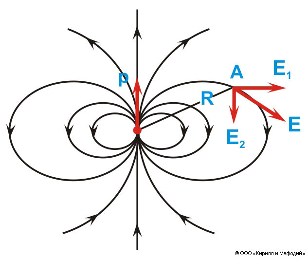 Электрическое поле диполя, изображенное с помощью силовых линий. В точке наблюдения A, находящейся на расстоянии R от центра диполя (R>>l), поле E (направленное по касательной к силовой линии) разложено на 2 компоненты: E1— параллельную оси диполя и E2 — перпендикулярную к ней.