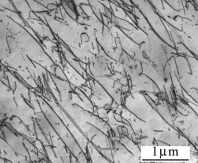 Дислокационная структура в пластически деформированном кремнии. Расстояния указаны в микронах. Предоставлено А. В. Марковым, лаборатория арсенида галлия, Гиредмет, Москва.