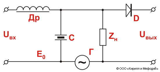 Схема каскада усиления диэлектрического усилителя: UВх — подводимое напряжение сигнала; Др — высокочастотный дроссель, защищающий источник усиливаемого сигнала от проникновения в него высокочастотных колебаний генератора Г; E0 — источник постоянного напряжения для установления рабочего режима на конденсаторе C; C — конденсатор с сегнетоэлектриком; Г — генератор высокочастотных колебаний; ZН — сопротивление нагрузки; D — диод; UВых — усиленное выходное напряжение сигнала.