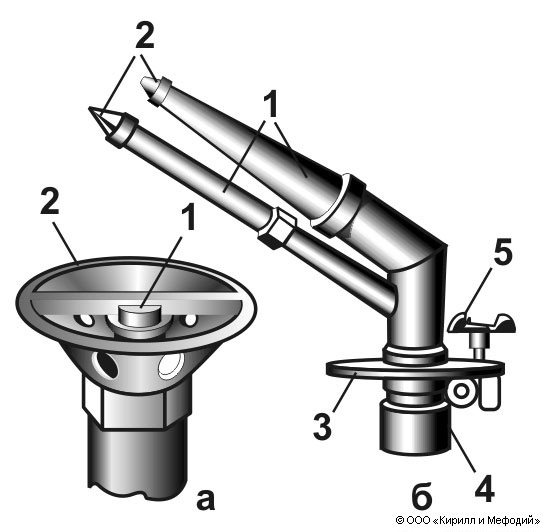 Рабочие органы дождевальных машин и установок: а — короткоструйная дефлекторная насадка (1 — дефлектор; 2 — воронка); б — дальнеструйный дождевальный аппарат (1 — стволы; 2 — сопла; 3 — вращающаяся опора; 4 — трубопровод; 5 — крыльчатка).