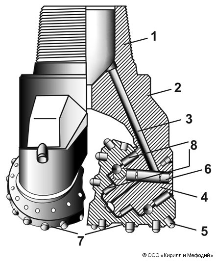 Трехшарошечное долото для сплошного бурения в очень крепких породах: 1 — наружная конусная присоединительная резьба (ниппель); 2 — секция (лапа); 3 — каналы в лапе и цапфе для продувки опоры; 4 — цапфа лапы; 5 — твердосплавные зубки с полусферической рабочей частью; 6 — замковый палец; 7 — шарошки: 8 — подшипники качения; 9 — центральный канал для продувки забоя и шарошек.