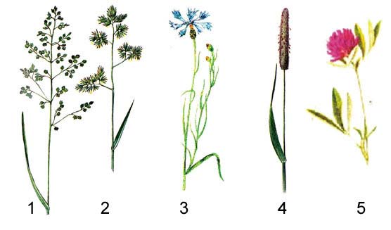 Виды-доминанты луговых сообществ Европейской части России: 1 — мятлик луговой, 2 — ежа сборная, 3 — василек полевой, 4 — лисохвост луговой, 5 — клевер красный.