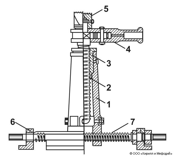 Винтовой домкрат на салазках: 1 — корпус; 2 — грузонесущий винт; 3 — направляющая рейка; 4 — рукоятка; 5 — чашка для груза; 6 — салазки; 7 — горизонтальный винт.