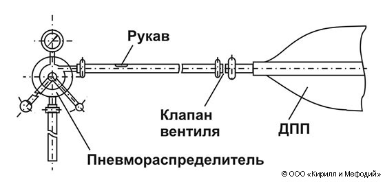 Пневматический домкрат: 1 — резинокордная оболочка; 2 — клапан вентиля; 3 — рукав; 4 — пневмораспределитель.