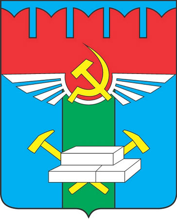Герб Домодедово, утвержденный 24 сентября 1985 года. Вверху эмблема Аэрофлота, внизу три серебряных бруска с золотыми молотками.