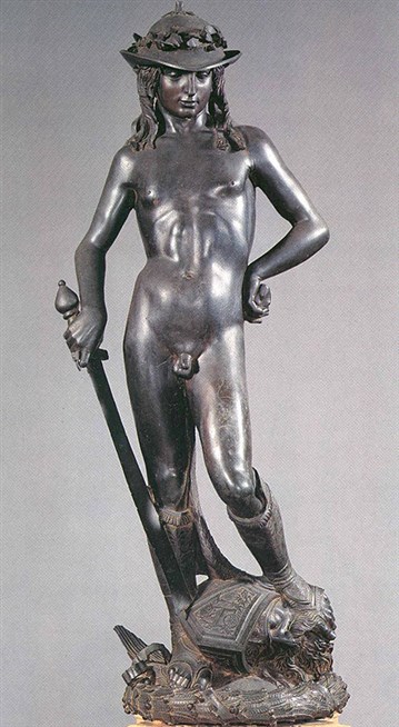 Донателло. Давид. Около 1433 года. Бронза. Палаццо Барджело, Флоренция. У ног Давида — голова поверженного Голиафа.