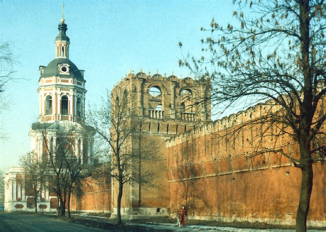 Донской монастырь. Вид на крепостную стену с башней со стороны улицы.