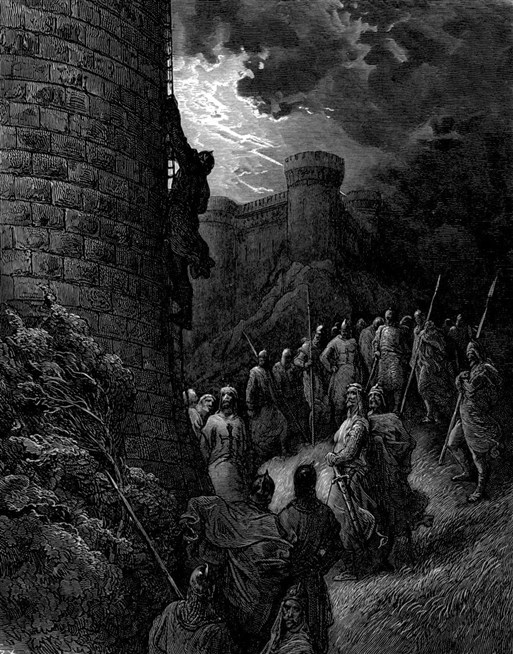 Гюстав Доре. Боэмунд Тарентский взбирается на стены Антиохии. Гравюра.