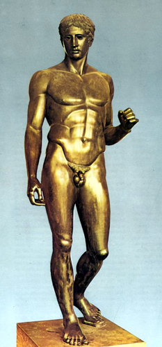 Поликлет. Дорифор. Высота 2, 12 м. 450-440 до н. э. Бронзированное воспроизведение, созданное на основе мраморных римских копий.