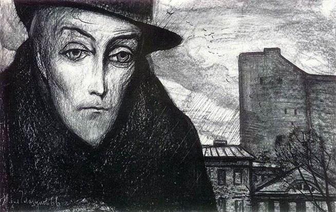 Иллюстрация роману «Идиот». Князь Мышкин после смерти Настасьи Филипповны. Художник И. Глазунов. 1966.