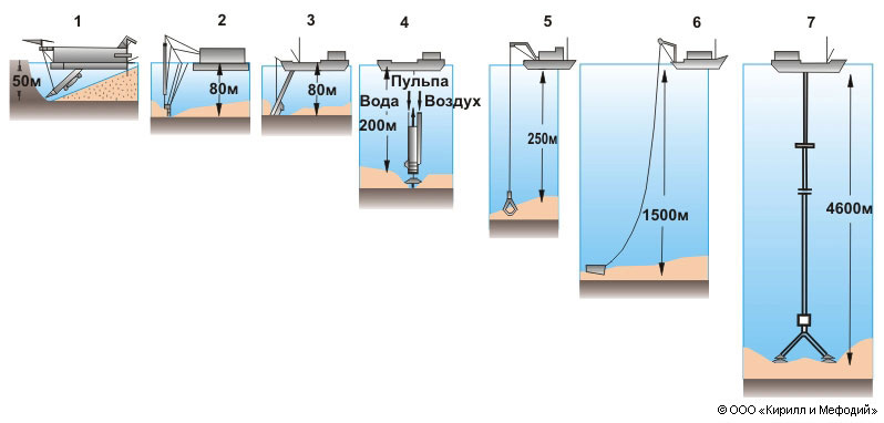 Типы драг, применяемых для разработки континентальных и морских россыпей различной глубины залегания: 1 — многочерпаковая; 2 — землесосная с механическим разрыхлителем; 3 — землесосная с гидравлическим разрыхлителем; 4 — эрлифтная; 5 — грейферная; 6 — драглайновая; 7 — эжекторная и землесосная с погружными насосами и перекачными станциями.