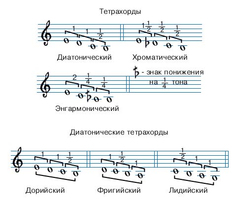 В свою очередь диатонические тетрахорды подразделяли на три вида: дорийский, фригийский и лидийский, которые отличались положением малой секунды.