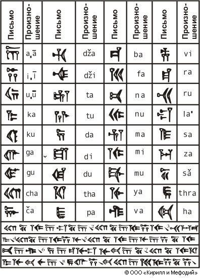 Древнеперсидский слоговой алфавит и образец древнеперсидской надписи (титул царя Дария).
