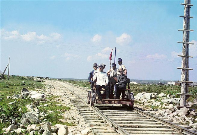 Железнодорожная дрезина. Мурманская железная дорога, близ Петрозаводска. Фотография С.М. Прокудина-Горского. 1915 год.