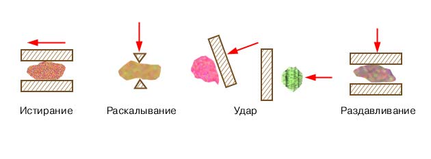 В зависимости от вида материала применяют различные способы дробления: мягкие и хрупкие материалы обычно дробят раскалыванием и ударом, прочные и вязкие – раздавливанием с истиранием, прочные и абразивные – раздавливанием.