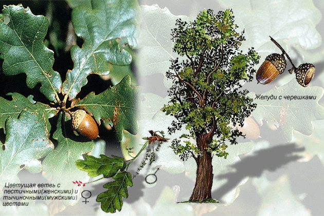 Дуб черешчатый: 1 — цветущая ветвь с пестичными (женскими) и тычиночными (мужскими) цветками; 2 — желуди с черешками.