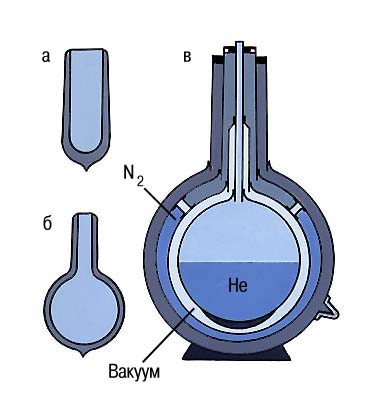Сосуды Дьюара: а, б — стеклянные; в — металлические для жидких газов (азота и гелия).