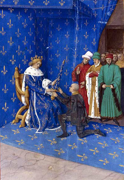 Карл V вручает шпагу коннетаблю Бертрану Дюгеклену, знаменитому своей отвагой и военной ловкостью. Иллюстрация из средневековой книги.