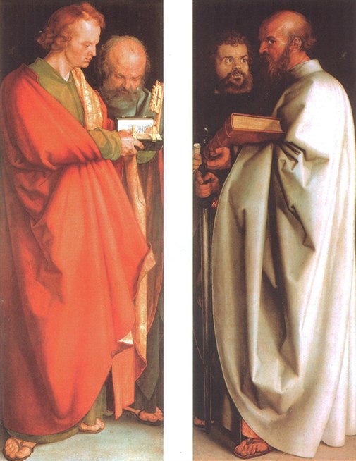 Альбрехт Дюрер. Четыре апостола. 1526 год. Дерево, масло. Старая пинакотека, Мюнхен. На первый план художник выдвинул святых Иоанна и Павла, пользовавшихся особым авторитетом у протестантов. На втором плане — Петр и Марк. Апостолы олицетворяют разный возраст и характеры человека..
