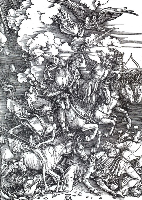Альбрехт Дюрер. Четыре всадника. 1498 год. Гравюра на дереве из цикла «Апокалипсис». На гравюре изображены Мор, Война, Голод и Смерть в виде старика. Под копытами их лошадей гибнут все, даже римский папа, которого заглатывает пасть дьявола.