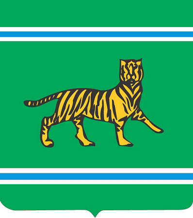 Герб Еврейской автономной области был принят 31 июля 1996 года. На геральдическом французском щите аквамаринового цвета в верхней и нижней части расположены узкие горизонтальные полоски, состоящие из белой, голубой и белой полосок, символизирующие реки Бира и Биджан. В центре герба изображен золотой уссурийский тигр с черными полосами. Тигр движется на восток, что имеет символическое значение.