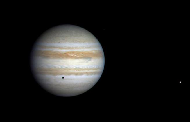 Европа отбрасывает тень на Юпитер. Фотография сделана АМС «Кассини» 4 октября 2000 с расстояния 81, 3 млн км от планеты.