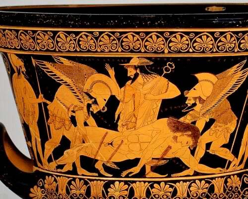 Евфроний и Эвкситий. Сон и Смерть уносят тело Сарпедонта. Краснофигурная чаша-кратер. Около 515 до н. э. Терракота. Музей Метрополитен, Нью-Йорк.