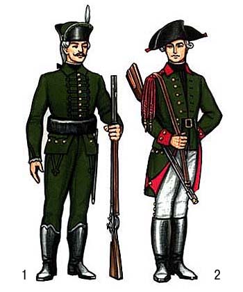 Мундиры егерей: 1 — 1765-1786; 2 — 1797-1801. Россия.