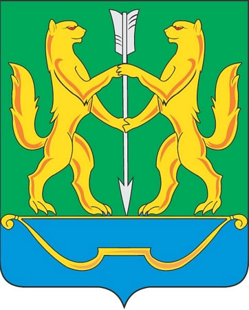 Герб Енисейска, принятый 10 июля 1998 года. В зеленом поле поверх лазоревой оконечности изображены два золотых соболя с червлеными глазами, стоящие на задних лапах на золотой тетиве золотого лука, держащие двумя передними лапами серебряную стрелу, острием упирающуюся в тетиву.