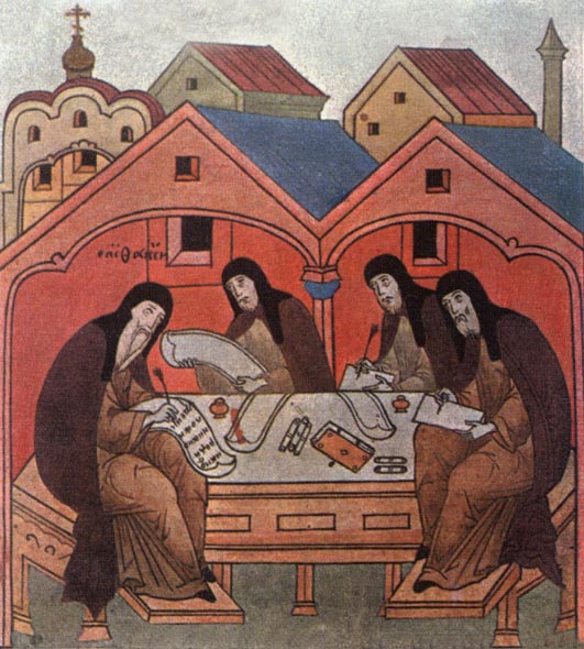 Писцы книг. Миниатюра из лицевого «Жития преподобного Сергия Радонежского» XVI в. из собрания Троице-Сергиевой Лавры. Епифаний Премудрый изображен слева. Фото: historydoc.edu.ru