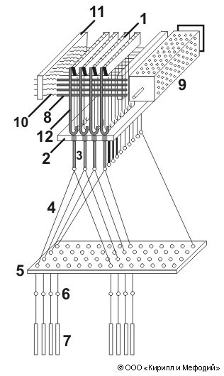 Жаккарда машина: 1 — ножи; 2 — рамная доска; 3 — рамные шнуры; 4 — аркатные шнуры; 5 — делительная доска; 6 — лицы; 7 — грузики; 8 — иглы; 9 — перфорированная призма; 10 — пружина; 11 — доска; 12 — крючки.
