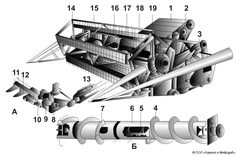 Шнековая жатка комбайна: 1 — плавающий транспортер; 2 — уравновешивающие пружины; 3 — поддержка мотовила; 4 — спиральная лента; 5 — пальчиковый механизм; 6 — кожух шнека; 7 — съемный виток шнека; 8 — коромысло; 9 — головка ножа; 10 — соединительное звено ножа; 11 — нож; 12 — палец; 13 — шатун; 14 — крестовина мотовила; 15 — лопасть мотовила; 16 — шнек; 17 — палец граблины мотовила; 18 — граблина мотовила; 19 — кривошип граблины; А — присоединение ножа режущего аппарата к шатуну; Б — шнек.