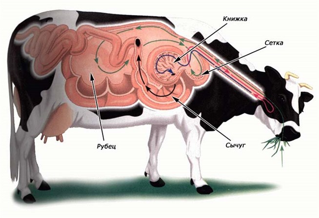 У жвачных парнокопытных млекопитающих желудок состоит из четырех отделов: рубца, сетки, книжки и сычуга.