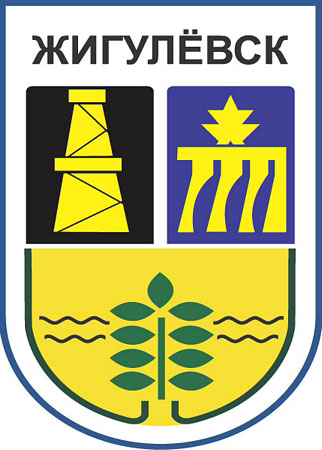 Герб Жигулевска, утвержденный в 1999 году. Нефтяная вышка отражает нефтегазодобывающее управление «Жигулевскнефть», развитие нефтяного хозяйства. Плотина говорит о Волжской ГЭС имени В.И. Ленина. Волны с лиственной ветвью символизируют национальный парк «Самарская лука».