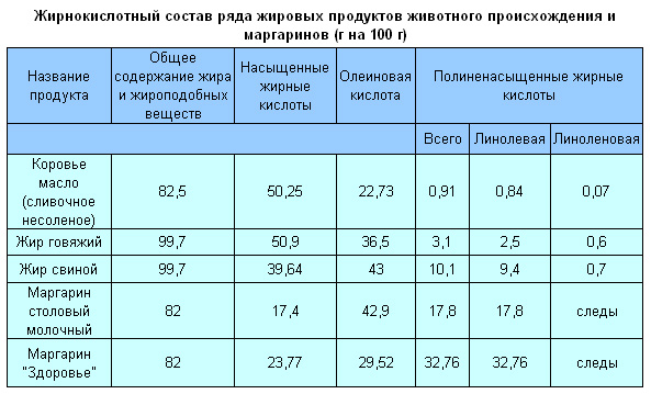 Жирнокислотный состав ряда жировых продуктов животного происхождения и маргарина
