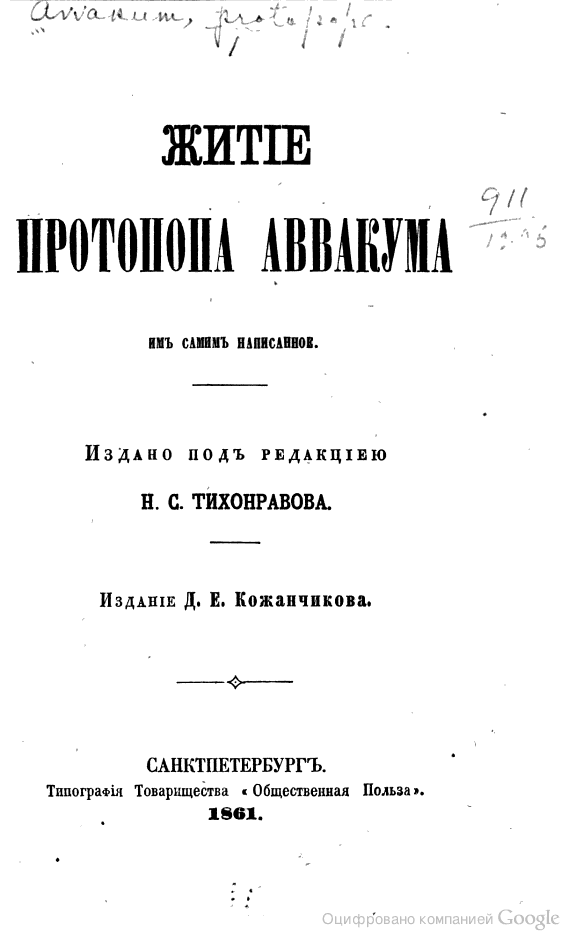 Титульный лист первого издания «Жития протопопа Аввакума». 1861 год. Фото: оцифровано компанией Google, books.google.ru