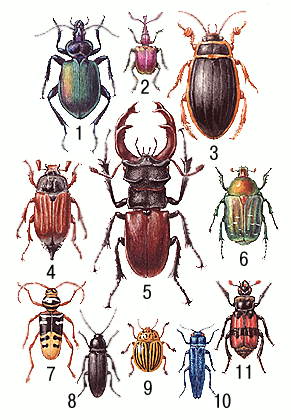 Жуки: 1 — жужелица (пахучий красотел); 2 — плодовая казарка; 3 — окаймленный плавунец; 4 — майский хрущ; 5 — жук-олень; 6 — золотистая бронзовка; 7 — пестрый усач; 8 — черный щелкун; 9 — колорадский жук; 10 — зеленая златка; 11 — погребальный могильщик.