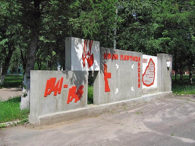 Жуковка. Мемориальный щит, посвященный партизанскому движению на Брянщине.