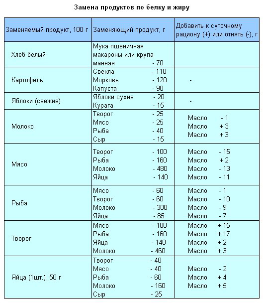 Замена продуктов по белку и жиру.