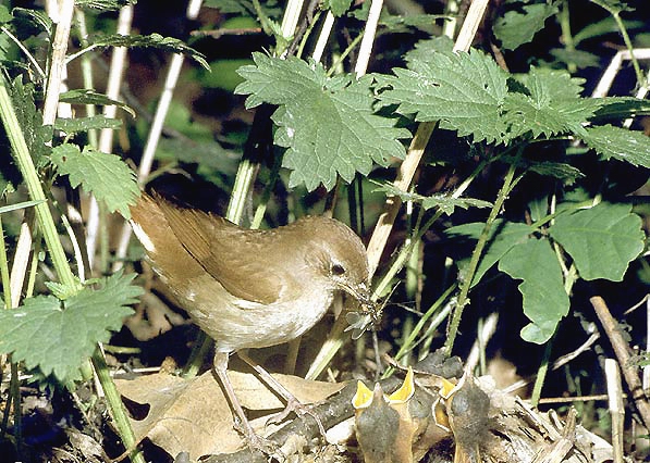 Западный соловей (Luscinia megarhynchos) у гнезда.