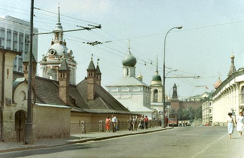 Зарядье. Улица Варварка (в советское время — Степана Разина). В перспективе улицы — Кремлевская стена, справа колоннада Гостинного двора, над ней купола собора Василия Блаженного, слева колокольня церкви Варвары великомученицы, церковь Максима Блаженного, колокольня Знаменского монастыря, крыша палат бояр Романовых, слева вверху угол здания гостиницы «Россия».
