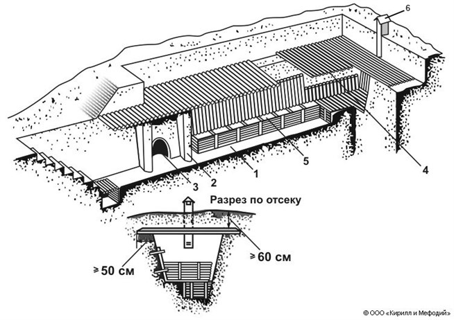 Противорадиационное укрытие из лесоматериалов: 1 — помещение для укрываемых людей; 2 — занавесы на входе; 3 — ниша для выносной тары; 4 — покрытие и одежда стен из подтоварника; 5 — скамьи для укрываемых людей; 6 — вытяжной короб.
