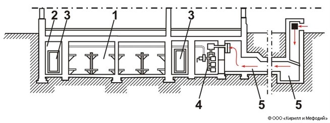 Убежище в подвале здания: 1 — отсеки для укрываемых людей; 2 — тамбур; 3 — защитно-герметические двери; 4 — фильтро-вентиляционная установка; 5 — аварийный выход, используемый для забора воздуха.